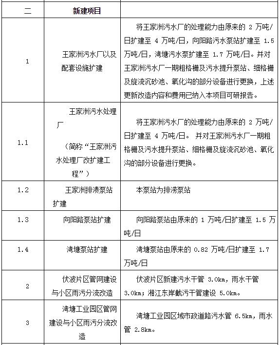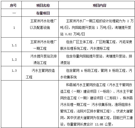 存量項目為王家洲污水處理廠以及配套設(shè)施。新建項目的建設(shè)內(nèi)容包括王家洲污水處理廠擴建、泵站擴建、管網(wǎng)建設(shè)與雨污分流改造工程、水環(huán)境智慧管控平臺建設(shè)工程。