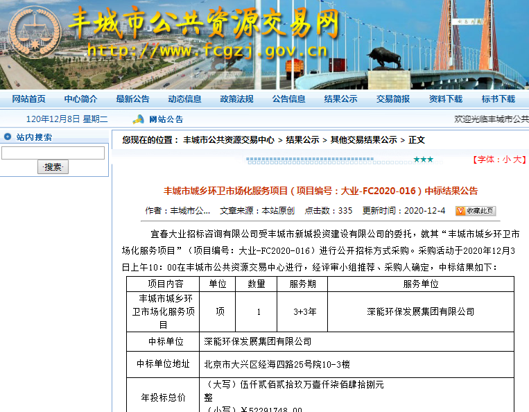 豐城市公共資源交易網(wǎng)發(fā)布豐城市城鄉(xiāng)環(huán)衛(wèi)市場化服務項目(項目編號:大業(yè)-FC2020-016)中標結果公告,公告顯示,深能環(huán)保發(fā)展集團有限公司(簡稱“深能發(fā)展”)中標豐城市城鄉(xiāng)環(huán)衛(wèi)市場化服務項目,年投標總價為52291748元,三年投標總價為156875244元。