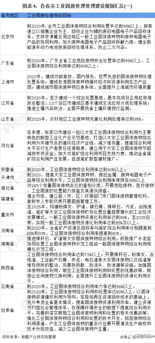 根據(jù)前瞻產(chǎn)業(yè)研究院匯總,截至2020年12月我國已經(jīng)有30多個省市地區(qū)就工業(yè)固廢處理的發(fā)展給出了相關的指導意見以及配套的措施,其中19個省份均已制定工業(yè)固廢處理綜合利用率階段性目標,并陸續(xù)出臺具體細化的地方性工業(yè)固廢處理政策扶持行業(yè)發(fā)展。