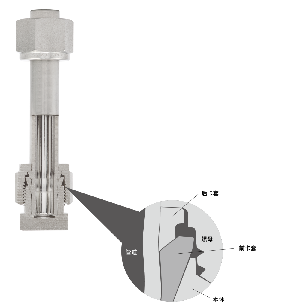 ●卡套接頭螺母螺紋鍍銀,可有效減少與接頭本體螺紋的摩擦系數(shù);