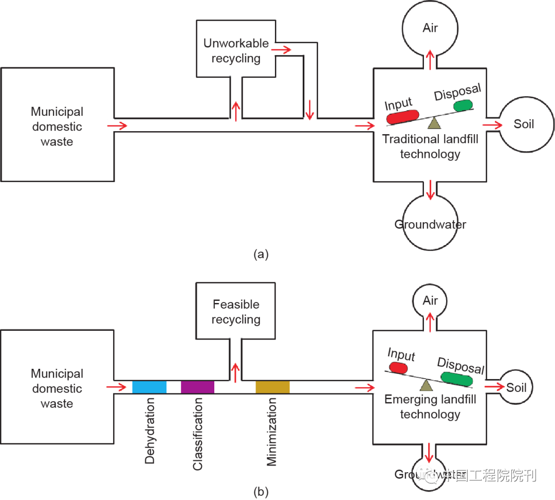 如何解決生活垃圾資源化循環(huán)不平衡、污染防治失控等關(guān)鍵問題,已成為社會、經(jīng)濟、環(huán)境保護和科技關(guān)注的焦點。近年來,我國政府高度重視改善環(huán)境問題,并加大了對生活垃圾處理的投資,這對于我國進一步推行綠色發(fā)展模式具有重要意義。在本文中,筆者強調(diào)城市生活垃圾全過程處理的重要性[圖1(b)],并分別對生活垃圾處理前端的分類、減量化與資源化技術(shù),以及末端的污染物快速消化、防泄漏與修復(fù)技術(shù)提出新思路和新建議。