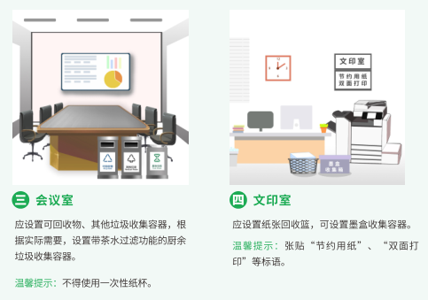 機關企事業(yè)單位、工業(yè)園區(qū)、商務寫字樓要發(fā)揮生活垃圾源頭減量示范作用,三份指引里明確提倡綠色辦公,優(yōu)先采購可循環(huán)利用的產(chǎn)品,減少使用一次性辦公用品,推廣無紙化辦公,紙張盡量雙面書寫或雙面打印。另外會議室貼合實際設置帶茶水過濾功能的廚余垃圾收集容器,著重提示不得使用一次性紙杯。