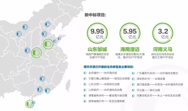 近日,博天環(huán)境集團(tuán)(603603.SH)通過聯(lián)合體合作方式分別贏取了位于山東省鄒城市、河南省義馬市和海南省澄邁縣的三個生態(tài)修復(fù)類項目。其中山東省鄒城市鄒西產(chǎn)煤塌陷區(qū)綜合治理PPP項目,投資概算約9.95億元;河南省義馬市澗河及石河生態(tài)綜合整治工程(PPP),項目總投資約3.2億元;海南省澄邁縣城鎮(zhèn)水環(huán)境綜合整治(大塘河、海仔河)PPP項目,估算總投資5.95億元。