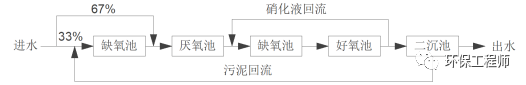 該工藝的主要目的是優(yōu)化除磷效果,第二個缺氧池進(jìn)水中含有一定量的碳源,該部分碳源反硝化速率較高,在該部分碳源消耗殆盡后,還可進(jìn)行內(nèi)源呼吸反硝化,雖然反硝化速率較低,但可進(jìn)一步提高TN的去除率。