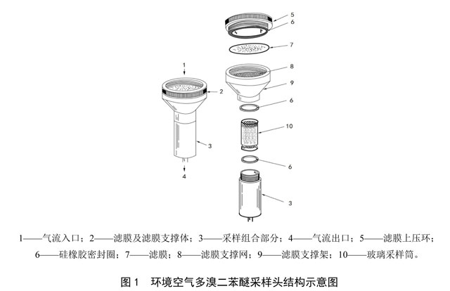 按HJ 194和HJ 691要求采樣,應(yīng)對(duì)采樣現(xiàn)場(chǎng)的氣溫、氣壓、風(fēng)速、風(fēng)向等氣象參數(shù)進(jìn)行測(cè)定,并對(duì)采樣過程中的技術(shù)參數(shù)進(jìn)行記錄。采樣前確認(rèn)石英/玻璃纖維濾膜(5.17)無破損后用鑷子輕輕夾住濾膜邊緣安裝在濾膜支撐網(wǎng)上,玻璃采樣筒安裝2塊 PUF(5.18),并安裝到采樣組合部分,按圖1依次安裝采樣頭,然后將采樣頭安裝在采樣器上并確保儀器穩(wěn)固。每次采樣前應(yīng)進(jìn)行采樣系統(tǒng)的氣密性和儀器運(yùn)行穩(wěn)定性等檢查,確保儀器符合要求后再進(jìn)行采樣。采樣結(jié)束后,關(guān)閉電源,卸下采樣頭,將采樣頭帶到干凈、無污染和避光的地方,取下濾膜,采樣塵面向里對(duì)折,取出玻璃采樣筒。兩者分別用鋁箔包好,放入保存盒中密封保存。采樣后的濾膜和PUF為環(huán)境空氣樣品。