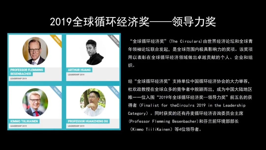 從我們國家來講,全國200多個大中城市,每年會產(chǎn)生2億多噸的垃圾,這個量非常大,如果中國的垃圾分類工作做好了,全世界的循環(huán)經(jīng)濟(jì)的工作就做好了三分之一,所以達(dá)沃斯世界經(jīng)濟(jì)論壇設(shè)立了一個全球循環(huán)經(jīng)濟(jì)獎,專門獎勵這方面的企業(yè)和領(lǐng)導(dǎo)人、專家,很榮幸在2019年,我作為中國大陸唯一的一個人入圍了它的領(lǐng)導(dǎo)力獎。