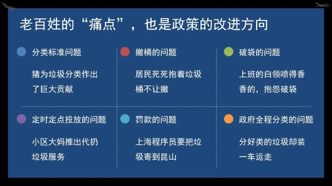 當(dāng)然除了分類的標(biāo)準(zhǔn)以外,還有撤桶的問題、破袋的問題、還有定時定點投放的問題、還有罰款的問題、還有政府是不是全程分類的問題,這些都是每個老百姓關(guān)注的。