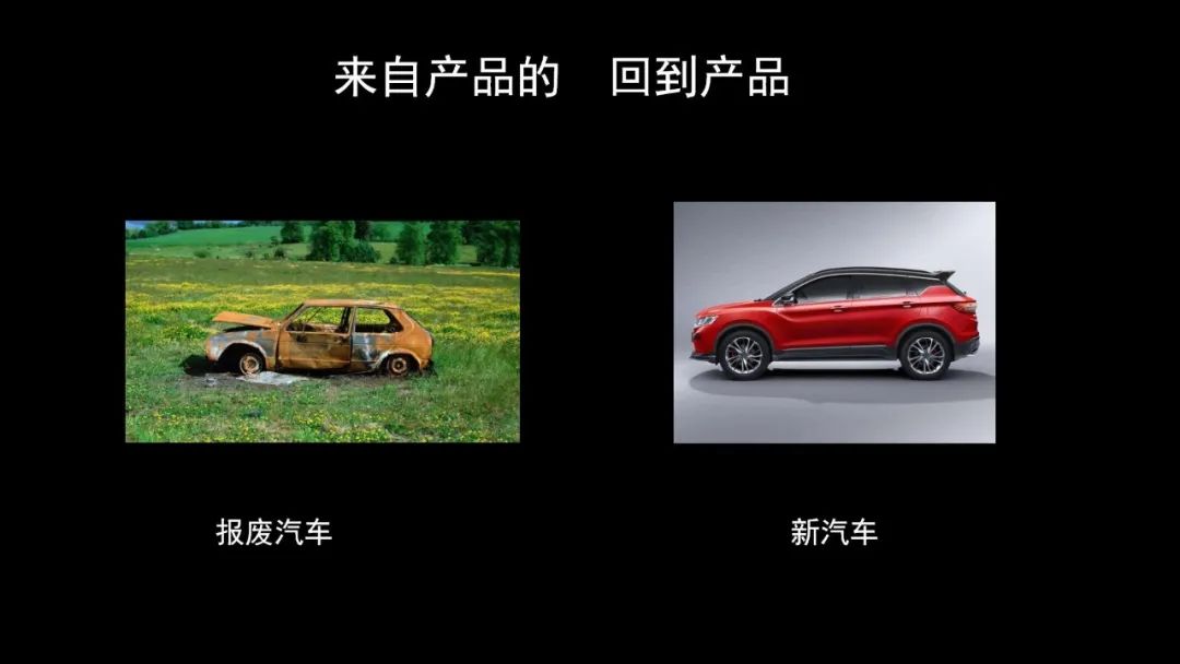 我們家報廢的舊汽車,把里面的金屬,把里面的銅鋁 鐵、塑料回收,可能變成你家接下來要的新汽車,我想這就是來自產(chǎn)品,回到產(chǎn)品。