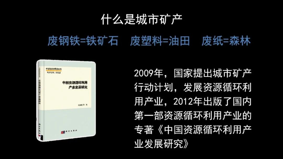 所以我們就提出了一個概念叫做:城市礦產(chǎn)。我們的礦產(chǎn)在城市里面,我們在座的每一位都是城市礦產(chǎn)的采掘工,廢鋼鐵就是鐵礦石,廢塑料就是石油,廢紙就是森林,這就是一個城市礦產(chǎn)的概念。