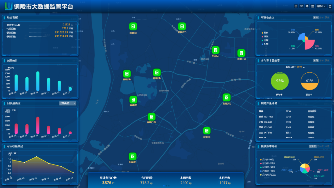 八個月來,廚余垃圾分出量增長了12.7倍,廚余垃圾分出率達(dá)到21.78%。垃圾分類社會動員成效明顯,居民知曉率平均為94.85%,參與率74.12%,正確投放率達(dá)到69.38%。2020年6月1日,銅陵正式實施《銅陵市生活垃圾分類管理條例》條例規(guī)定,鼓勵探索采用智能回收平臺等方式,提高生活垃圾分類投放的準(zhǔn)確率。鼓勵再生資源回收利用企業(yè)建立再生資源回收利用信息化平臺,向社會公眾提供預(yù)約回收服務(wù)以及可回收物目錄、回收價格、回收方式等信息。