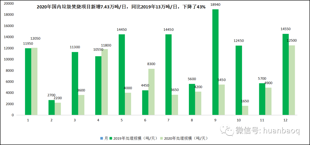 稍加留意就會發(fā)現(xiàn),相較于前兩年的大項目頻現(xiàn),各家企業(yè)中標(biāo)捷報頻傳,2020年類似的報道少了許多,全國釋放的垃圾焚燒項目罕見下滑,新增項目開始“降溫”。這一現(xiàn)象,筆者早在去年6月就注意到了,當(dāng)時還以為是受疫情的影響,但其實大家都想錯了。據(jù)筆者長期跟蹤各省政府采購網(wǎng)統(tǒng)計得出,2020年1月-12月,國內(nèi)新中標(biāo)的垃圾焚燒發(fā)電項目累計72個,相比2019年新中標(biāo)120個項目減少48個,同比下滑了40%;新增日處理規(guī)模7.43萬噸/日,相比2019年近13萬噸/日的新增規(guī)模,同比減少了43%;總投資373億元,相比2019年總投資600億元也減少了227億元,降幅達(dá)到37.83%。(項目清單詳見文末)看得出來,2020年國內(nèi)釋放的垃圾焚燒項目,無論是中標(biāo)數(shù)量,還是日處理規(guī)模,亦或是總投資額,與2019年相比都有4-5成左右的下滑,下降的不是一點點,而是幾乎“腰斬”。從月份來看,除了1月、4月、6月,2020年新增的日處理規(guī)模較2019年有所增長外,其余每個月份都有著不同程度的下滑,少則3-6千噸/日,多則上萬噸/日。其中,5月、7月、9月、10月四個月的下降幅度最大,均是萬噸/日級別以上的減少。(如圖一、圖二所示)圖一:2019年VS2020年,全國釋放的垃圾焚燒項目規(guī)模對比圖二:2020年國內(nèi)垃圾焚燒項目新增7.43萬噸/日,同比下降了43%02