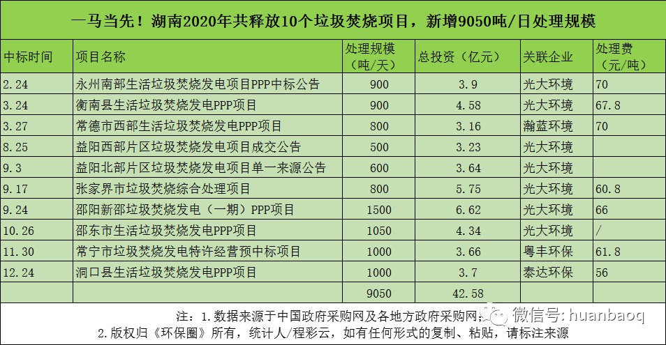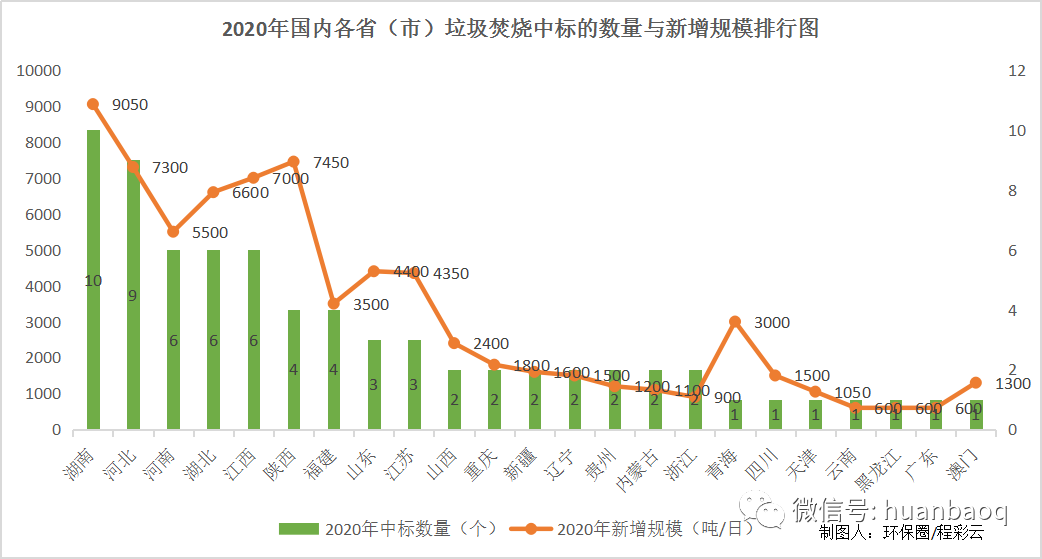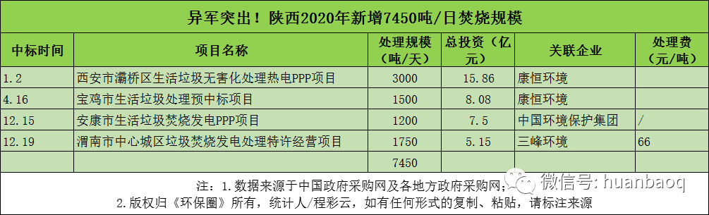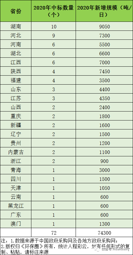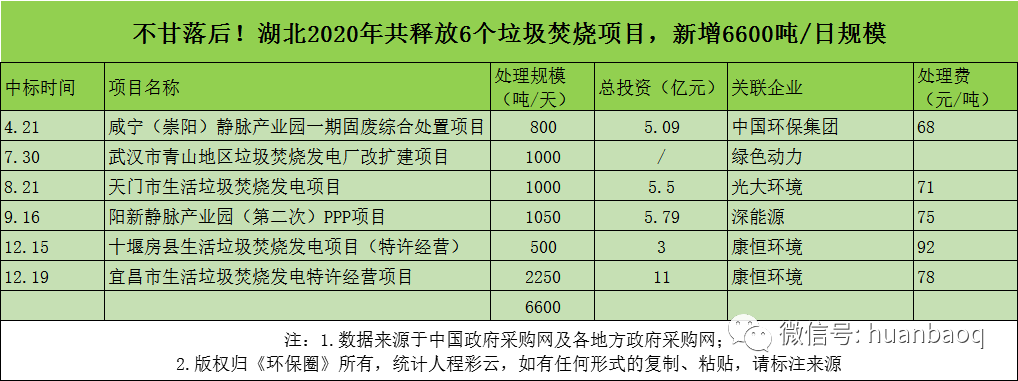 從項目分布的省份來看,2020年定標(biāo)的72個垃圾焚燒項目,分別分布在湖南、湖北、河南、河北、江西、陜西、福建、山東、江蘇等23個省市,其中湖南、湖北、江西、陜西在垃圾焚燒領(lǐng)域大放異彩,成為全國興建垃圾焚燒廠數(shù)量最多、新增規(guī)模最大的4個省份(如圖三、圖四所示)。圖三:2020年定標(biāo)的72個垃圾焚燒項目,分布的省市圖四:2020年國內(nèi)各省(市)垃圾焚燒中標(biāo)的數(shù)量、新增規(guī)模排行但與此同時,總體上看,2020年國內(nèi)絕大多數(shù)地區(qū)垃圾焚燒投資速度都是在放緩的,政府招投標(biāo)活動不及2019年,下滑幅度最大的是“冀魯豫”三省。以河南為例,2019年河南省累計開標(biāo)26個垃圾焚燒項目,新增處理規(guī)模3.22萬噸/日;而到了2020年,則只有6個垃圾焚燒項目完成評標(biāo),新增處理規(guī)模5500噸/日,只有2019年的“零頭”。在河北,2019年全省新增21個垃圾焚燒項目,新增處理規(guī)模2.51萬噸/日;而到了2020年,這一數(shù)據(jù)則下滑到9個項目,新增處理規(guī)模7300噸/日,不足2019年的1/3。還有山東省,2019年山東全省共有11座垃圾焚燒項目完成定標(biāo)工作,新增處理規(guī)模近萬噸/日;而2020年,山東則只有3個垃圾焚燒項目開啟招標(biāo),新增規(guī)模不及2019年的一半。與以上這些省份相比,“兩湖兩西”--湖南、湖北、山西、陜西4省,則在其他省市投資速度放緩時“”異軍突起,不懼國補滑坡的負(fù)面效應(yīng),在2020年迎來了垃圾焚燒市場的大爆發(fā)。4省之中,湖南省“一馬當(dāng)先”。省內(nèi)永州、常德、益陽、張家界、常寧、邵陽等城市紛紛開啟招投標(biāo)工作,2020年共有10個垃圾焚燒項目完成定標(biāo),新增9050噸/日的處理規(guī)模,僅光大環(huán)境一家就斬獲其中7個項目,吃掉了70%的市場份額,成為湖南垃圾焚燒市場的“大贏家”(如圖五所示)。湖北也是“不甘落后”。雖然釋放速度不及湖南,但去年也是新增了6個垃圾焚燒大標(biāo),其中4個都是千噸級別的項目,宜昌市垃圾焚燒項目更是難得一見2250噸/日的大項目,吸引了光大環(huán)境、中國環(huán)境保護(hù)集團、綠色動力、深能、康恒環(huán)境等固廢大咖前來競標(biāo)(如圖六所示)。還有江西省。據(jù)《環(huán)保圈》跟蹤發(fā)現(xiàn),2019年江西垃圾焚燒新增規(guī)模共計3400噸/日,而2020年這一數(shù)據(jù)則攀升至7000噸/日,其中5個垃圾焚燒項目都是千噸級別以上(如圖七所示)。增長最明顯還屬陜西省。據(jù)《環(huán)保圈》進(jìn)一步跟蹤,2019年陜西境內(nèi)大多生活垃圾還靠填埋,垃圾焚燒普及率非常低,鄰避矛盾突出。而到了2020年,西安灞橋區(qū)、寶雞市、安康市、渭南中心城區(qū)等地紛紛開啟項目招投標(biāo)工作,雖然只有4個項目完成了定標(biāo)工作,但處理規(guī)模也一躍達(dá)到7500噸/日,僅次于湖南(如圖八所示)。03
