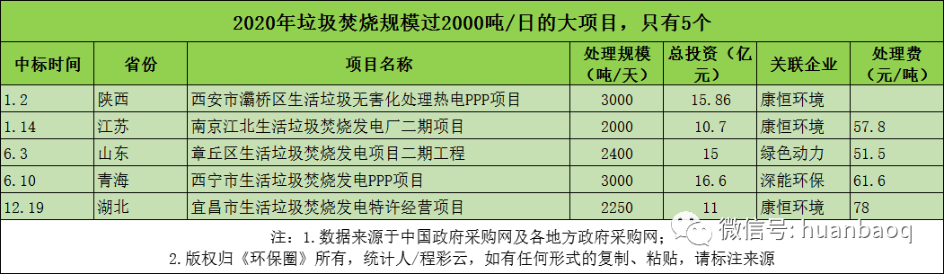 先是水務(wù)巨頭三峽集團旗下子公司在湖北宜昌15天內(nèi)接連中標(biāo)2個垃圾焚燒發(fā)電訂單,高調(diào)“跨界”;緊接著半路出家、轉(zhuǎn)型不到3年的城發(fā)環(huán)境又要合并老牌環(huán)企啟迪環(huán)境,試圖打造黃河流域高質(zhì)量環(huán)保發(fā)展平臺;然后“康恒僑銀”CP組合又從中國天楹、高能環(huán)境、偉明環(huán)保等一眾固廢名企中脫穎而出,中標(biāo)近5億元的湖北利川垃圾收集和焚燒發(fā)電一體化項目;最后,背靠浙江國資的浙能電力還擬以20.40元/股的價格,收購康恒環(huán)境最高5.9%的股權(quán)。然而,與開年垃圾焚燒領(lǐng)域的熱鬧勝景相比,去年國內(nèi)垃圾焚燒新增市場倒顯得“冷清”了許多。新中標(biāo)項目急劇下滑,各省市釋放的垃圾焚燒項目也少多了,與2019年“每3天上馬一個新項目”的火爆態(tài)勢相比,新中標(biāo)項目數(shù)量、日處理規(guī)模等各項數(shù)據(jù)均是“斷崖式下滑”。(相關(guān)鏈接:火!每3天上1個項目!解析2019全國垃圾焚燒市場“動向”)“市場可以公開競標(biāo)的項目一年比一年少,有些固廢名企的市場投資部都撤銷了,所以別再說什么垃圾焚燒項目‘跑馬圈地’了,都快沒‘地’可圈了。”某固廢企業(yè)市場投資部經(jīng)理表示。垃圾焚燒項目為啥少了?日處理規(guī)模數(shù)據(jù)為啥出現(xiàn)“斷崖式下滑”?市場真的沒“地”可圈了嗎?接下來,筆者將從項目分布的省份、日處理規(guī)模、總投資、中標(biāo)企業(yè)、處理費等五大角度,通過大數(shù)據(jù)來解析一下2020國內(nèi)垃圾焚燒行業(yè)的四大特征,從而解釋之前高速增長的垃圾焚燒行業(yè)為何會在2020年迎來拐點?是“國補新政”惹得禍,還是市場真實需求在下滑?并提出“十四五”期間國內(nèi)垃圾焚燒市場發(fā)展的幾點建議,供大家參考。01