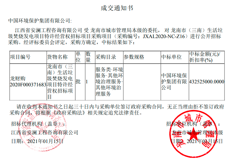 原標(biāo)題:經(jīng)歷一波三折 中國(guó)環(huán)境保護(hù)集團(tuán)中標(biāo)4.3億元江西龍南市垃圾發(fā)電項(xiàng)目