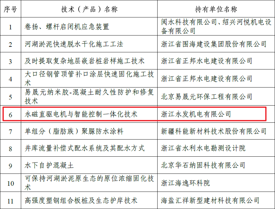 為進一步推動浙江省水利工程建設(shè)領(lǐng)域技術(shù)創(chuàng)新和成果轉(zhuǎn)化,提升水利工程建設(shè)的科技水平,經(jīng)征集、評審和公示等程序,結(jié)合近三批《浙江省水利新技術(shù)推廣指導(dǎo)目錄》,由浙江永發(fā)機電有限公司自主研發(fā)的“永磁直驅(qū)電機與智能控制一體化技術(shù)”等共28項技術(shù)(產(chǎn)品)列入2020年度浙江省水利工程建設(shè)領(lǐng)域新技術(shù)推廣應(yīng)用清單。