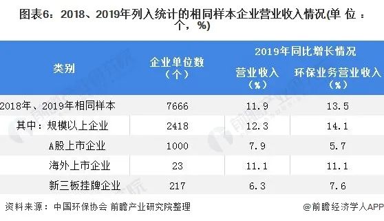 2019年,統(tǒng)計范圍內共有7666家企業(yè)同為2018年我國環(huán)保產業(yè)發(fā)展狀況的綜合量化分析樣本,與2018年相比,上述企業(yè)的營業(yè)收入增長了11.9%,其中,環(huán)保業(yè)務營業(yè)收入同比增長13.5%。上述企業(yè)中規(guī)模以上企業(yè)2418家,其營業(yè)收入同比增長12.3%、環(huán)保業(yè)務營業(yè)收入同比增長14.1%;