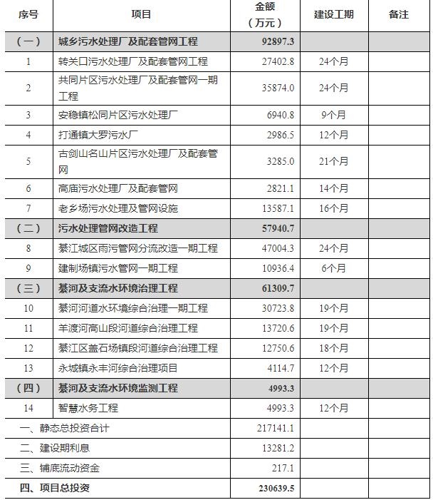 綦江區(qū)綦河流域水環(huán)境綜合治理(一期)PPP項目圍繞綦河流域綜合治理和可持續(xù)發(fā)展,合法依歸重點實施污水處理廠(站)、雨污管網(wǎng)、環(huán)境治理、智慧水務(wù)等建設(shè)內(nèi)容。本項目共包含四大類14個子項目,項目可研批復項目總投資約為230639.5萬元,其中建安工程費用合計173431萬元,工程建設(shè)其它費用28408萬元,預備費用15302.1萬元,建設(shè)期利息13281.2萬元,鋪底流動資金221.5萬元。