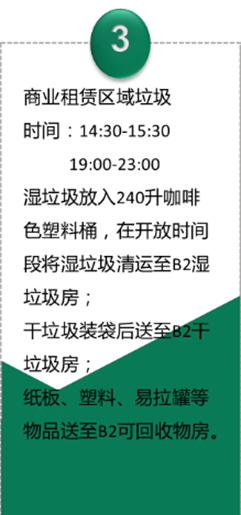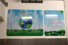 上海中心大廈對B2垃圾房(地下2層)進(jìn)行改造,改造后的垃圾房針對不同垃圾進(jìn)行分區(qū)管理,并添加了垃圾分類相關(guān)的宣傳海報及公示欄。結(jié)合BOMA(中國)標(biāo)準(zhǔn)將管理文件、警示標(biāo)志,以及清潔消毒藥劑MSDS張貼上墻,引導(dǎo)白領(lǐng)、租戶正確投放垃圾。