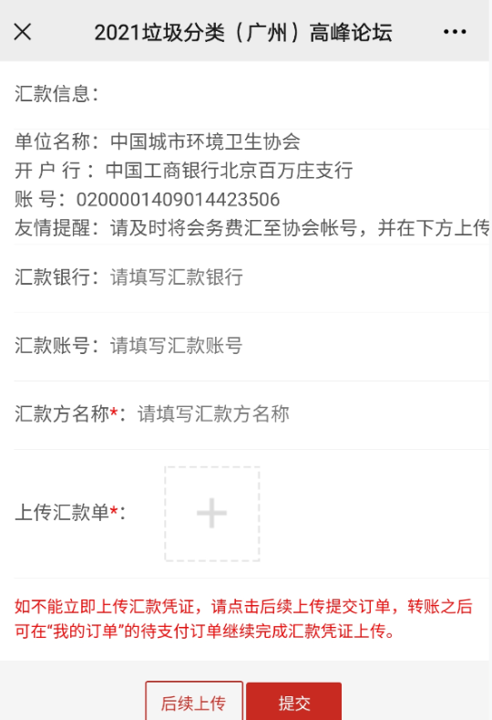 (溫馨提示:匯款請務(wù)必備注“單位名稱+垃圾分類高峰論壇”,并在匯款后在線提交匯款單)