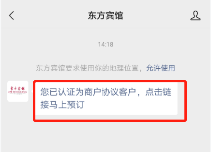 2、關(guān)注公眾號(hào)后點(diǎn)擊對話框鏈接進(jìn)入酒店預(yù)定頁面;