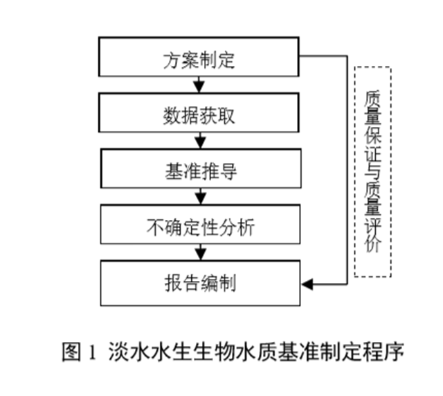 淡水水生生物水質基準的制定包括方案制定、數據獲取、基準推導、不確定性分析、報告編制和質量保證與質量評價 6 個步驟,制定程序見圖 1。