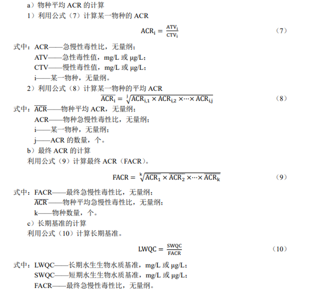 c)當慢性毒性數據不足時,可采用急慢性毒性比(ACR)方法推導長期基準。應用 ACR方法至少需要3個動物物種(1 種魚類、1 種水生無脊椎動物、任1種其他水生動物)的急、慢性毒性數據,每一個物種的急、慢性毒性數據應來自同一個實驗室。當獲得的用于計算ACR的所有急、慢性毒性數據來自同一篇文獻時,需補充測試至少1種水生脊椎動物和1種水生無脊椎動物的急、慢性毒性數據用于計算 ACR。