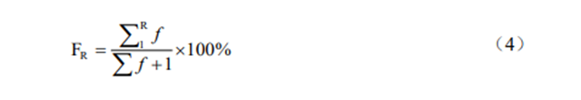 將 lgSMAV 和 lgSMCV 從小到大分別進行排序,確定其秩次 R(數值最小的秩次為1,次之秩次為 2,依次排列,如果有兩個或兩個以上物種的數值相同,將其任意排成連續(xù)秩次),分別計算物種的急性和慢性累積頻率 FR,計算方法見公式(4):