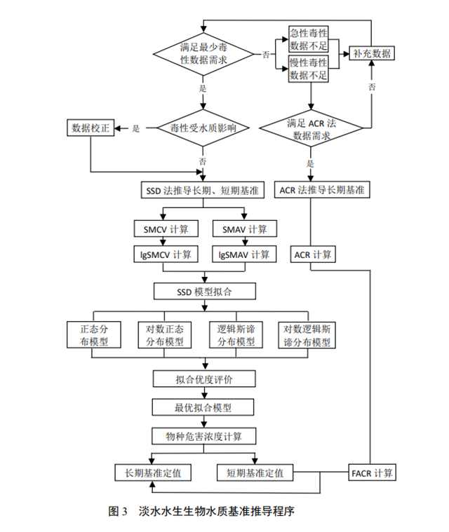 采用 SSD 法推導淡水水生生物水質基準,利用適宜的模型對物種敏感度的分布進行擬合后,計算出能保護 95%生物的污染物濃度,經評估因子外推后獲得基準。包括毒性數據預處理、模型擬合與評價、物種危害濃度確定和基準定值等步驟,推導程序見圖 3。