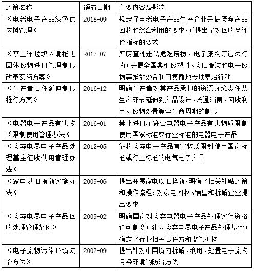 為了規(guī)范電子廢棄物的回收處理、提高回收效率、改善自然與社會(huì)環(huán)境,中國(guó)政府出臺(tái)了一系列政策,助力行業(yè)可持續(xù)發(fā)展。