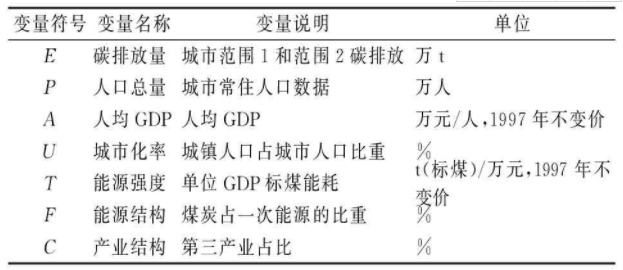 其中:P為人口規(guī)模;A為人均富裕程度;T為技術(shù)水平;a為人口規(guī)模系數(shù);b為人均富裕程度系數(shù);c為技術(shù)水平系數(shù);e為隨機(jī)環(huán)境誤差。因變量I為環(huán)境影響程度,如CO2排放量,該模型是STIRPAT方程的隨機(jī)形式,可對(duì)各因素對(duì)環(huán)境造成的非比例影響進(jìn)行研究(表2)。除上述自變量外,其他可以對(duì)環(huán)境造成影響的因素也可引入該模型進(jìn)行擴(kuò)展,從而分析其對(duì)環(huán)境的影響。本文選取人口總量(P)、人均GDP(A)、城市化率(U)、能源強(qiáng)度(T)、能源結(jié)構(gòu)(F)和產(chǎn)業(yè)結(jié)構(gòu)(C)6項(xiàng)因素作為自變量對(duì)STIRPAT模型進(jìn)行擴(kuò)展,得到擴(kuò)展后的模型見式(1)。