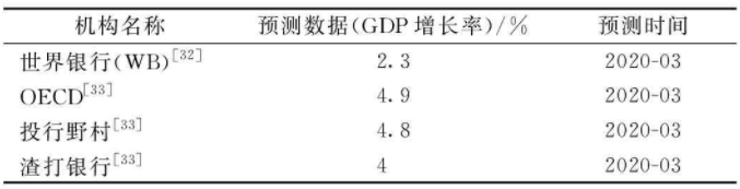 1)人口。2018—2019年上海市常住人口數(shù)據(jù)來自《2018年上海市國(guó)民經(jīng)濟(jì)和社會(huì)發(fā)展統(tǒng)計(jì)公報(bào)》《2019年上海市國(guó)民經(jīng)濟(jì)和社會(huì)發(fā)展統(tǒng)計(jì)公報(bào)》,2020—2035年人口增長(zhǎng)率來自聯(lián)合國(guó)人口預(yù)測(cè)。2)經(jīng)濟(jì)情況。2018—2019年上海市GDP數(shù)據(jù)來自《2018年上海市國(guó)民經(jīng)濟(jì)和社會(huì)發(fā)展統(tǒng)計(jì)公報(bào)》《2019年上海市國(guó)民經(jīng)濟(jì)和社會(huì)發(fā)展統(tǒng)計(jì)公報(bào)》;鑒于2020年新型冠狀病毒疫情對(duì)中國(guó)各省市經(jīng)濟(jì)活動(dòng)造成一定程度的影響,根據(jù)不同研究機(jī)構(gòu)的預(yù)測(cè)(表3),綜合我國(guó)經(jīng)濟(jì)結(jié)構(gòu)實(shí)際情況,最終確定中國(guó)2020年GDP增速為4.5%,上海市2020年GDP增長(zhǎng)率為4.5%。表3 各機(jī)構(gòu)對(duì)2020年中國(guó)經(jīng)濟(jì)的預(yù)測(cè)