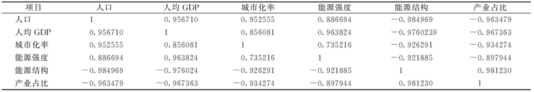 原始指標(biāo)的Pearson相關(guān)系數(shù)矩陣如表4所示??梢钥闯?,大部分指標(biāo)之間存在高度相關(guān)性。其中,人均GDP和人口數(shù)的相關(guān)系數(shù)高達(dá)0.96,城市化率與能源強(qiáng)度和人口之間的相關(guān)系數(shù)絕對(duì)值也超過0.86。由于各個(gè)變量之間的相關(guān)性較強(qiáng),可以使用主成分分析提取主成分。