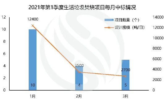 據(jù)E標(biāo)通統(tǒng)計(jì),2021年第1季度共計(jì)釋放19個(gè)生活垃圾焚燒項(xiàng)目,新增日處理能力1.86萬(wàn)噸/日。其中,1月份釋放生活垃圾焚燒項(xiàng)目最多(10個(gè)),新增日處理能力1.24萬(wàn)噸/日。