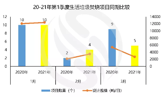 與2020年第1季度進(jìn)行同期比較,從項(xiàng)目數(shù)量上看,2020年第1季度共計(jì)中標(biāo)21個(gè)生活垃圾焚燒項(xiàng)目,2021年第1季度共計(jì)成交19個(gè)焚燒項(xiàng)目,同比減少2個(gè)焚燒項(xiàng)目。從新增日處理規(guī)???,2020年第1季度新增焚燒日處理規(guī)模1.96萬(wàn)噸/日,21年則下降至1.86萬(wàn)噸/日,同比下降1000噸/日。結(jié)合各省市陸續(xù)發(fā)布的生活垃圾焚燒中長(zhǎng)期規(guī)劃及國(guó)補(bǔ)政策的調(diào)整等因素,生活垃圾焚燒項(xiàng)目的增速放緩或成定勢(shì)。2020-2021年每月同期比較情況見(jiàn)上圖。