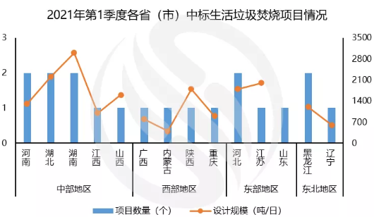 具體看,2021年第1季度,中部地區(qū)成交生活垃圾焚燒項(xiàng)目最多,共計(jì)8個(gè),新增日處理能力9100噸/日,其中:河南、湖北、湖南各釋放2各項(xiàng)目,江西和山西各釋放1個(gè)項(xiàng)目;其次西部地區(qū)和東部地區(qū),各成交4個(gè)焚燒項(xiàng)目,新增日處理能力分別為3900噸/日和3800噸/日;東北地區(qū)釋放3個(gè)項(xiàng)目,新增日處理能力1800噸/日。