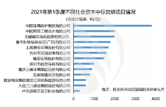 從中標(biāo)社會(huì)資本方看,1季度新增規(guī)模最多的社會(huì)資本為中國(guó)環(huán)保,連續(xù)拿下陜西安康市生活垃圾焚燒項(xiàng)目、江西龍南市生活垃圾焚燒項(xiàng)目和河南封丘縣生活垃圾焚燒項(xiàng)目,焚燒日處理能力新增3800噸/日。其次為中國(guó)恩菲工程技術(shù)有限公司和無(wú)錫錫東環(huán)保能源有限公司,分別憑借1個(gè)項(xiàng)目新增日處理規(guī)模2000噸/日。
