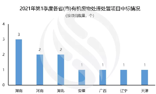 項(xiàng)目分布在湖南、河南、湖北、安徽、廣西、遼寧和天津等7個(gè)省市,中部地區(qū)釋放最多,共計(jì)釋放8個(gè)項(xiàng)目。其中,湖南省釋放項(xiàng)目最多,1季度共計(jì)成交3個(gè)有機(jī)廢棄物處理處置項(xiàng)目;其次為河南和湖北省,分別釋放2個(gè)項(xiàng)目,其余4個(gè)省市各成交1個(gè)項(xiàng)目。