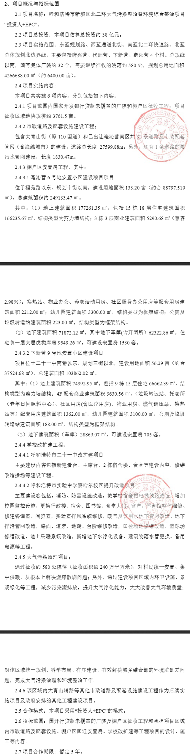 項目位于呼和浩特市新城區(qū),東至規(guī)劃路,西至通道北街,南至北二環(huán)快速路,北至總體規(guī)劃北邊界線,規(guī)劃總用地面積約4.3平方公里,擬采用 ABO+EPC 的運作模式實施,主要合作內(nèi)容包括廠院和棚戶區(qū)征收工程、市政道路及配套設(shè)施建設(shè)工程、棚戶區(qū)安置房工程及學(xué)校改擴(kuò)建工程、大氣污染治理項目。