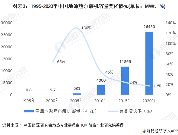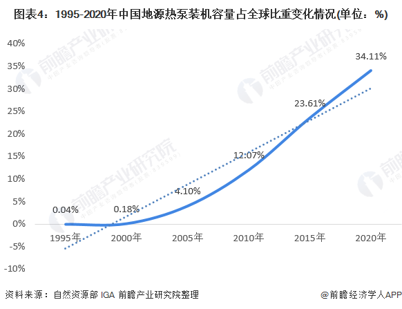 從裝機(jī)容量占全球總量的比重看,國(guó)內(nèi)地源熱泵裝機(jī)容量占比已從1995年的0.04%上升到2015年的23.61%,2020年國(guó)內(nèi)地源熱泵裝機(jī)容量占全球的比重上升到34.11%,且增長(zhǎng)速度持續(xù)加快。