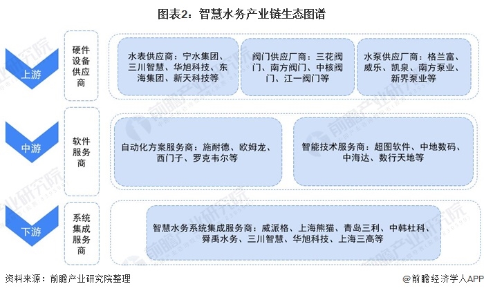上游的水表供應商、閥門供應商、水泵供應商分別為下游的系統(tǒng)集成服務商提供水表、閥門、水泵等硬件設備。