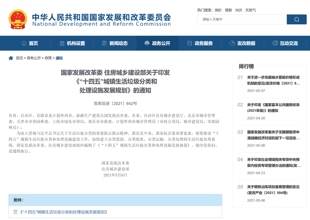 5月6日,國家發(fā)展改革委、住房城鄉(xiāng)建設部聯(lián)合下發(fā)關于印發(fā)《“十四五”城鎮(zhèn)生活垃圾分類和處理設施發(fā)展規(guī)劃》的通知(發(fā)改環(huán)資〔2021〕642號)。