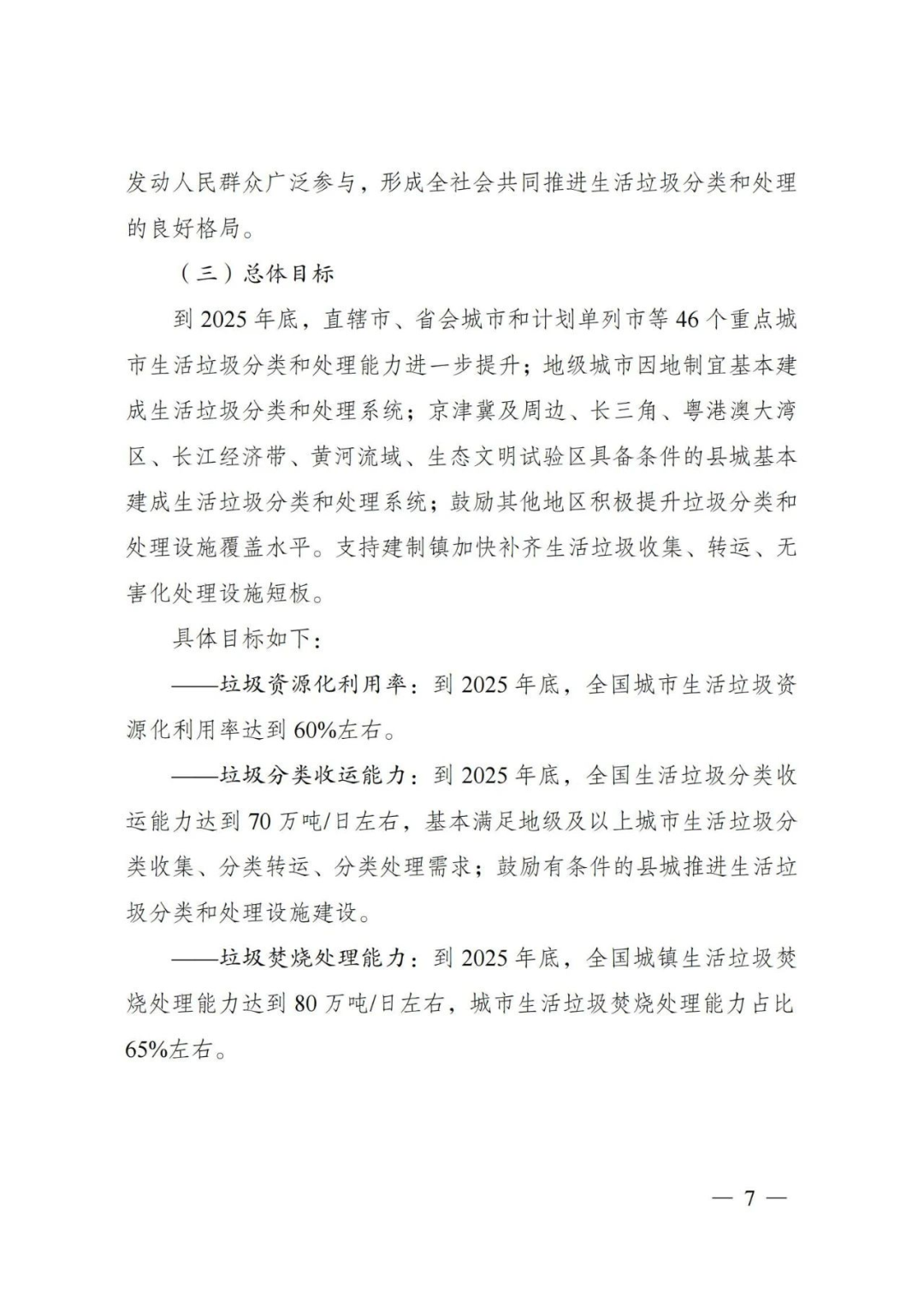 到2025年底,直轄市、省會城市和計劃單列市等46個重點城市生活垃圾分類和處理能力進一步提升;地級城市因地制宜基本建成生活垃圾分類和處理系統(tǒng);京津冀及周邊、長三角、粵港澳大灣區(qū)、長江經(jīng)濟帶、黃河流域、生態(tài)文明試驗區(qū)具備條件的縣城基本建成生活垃圾分類和處理系統(tǒng);鼓勵其他地區(qū)積極提升垃圾分類和處理設施覆蓋水平。支持建制鎮(zhèn)加快補齊生活垃圾收集、轉運、無害化處理設施短板。