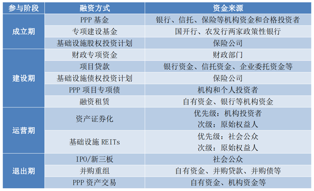 第一,PPP項目融資來源有限、融資方式單一,且部分綠色PPP項目融資落地難度大。融資是PPP項目最基礎(chǔ)的一環(huán),在不同階段,PPP項目有不同的融資方式,且隨著各部委、各省市連續(xù)的政策推動,PPP融資方式日益多元化。PPP項目融資模式如下表所示: