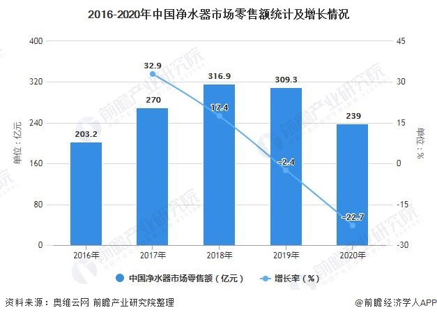2020年受新冠疫情的影響,一方面房地產(chǎn)開(kāi)工建設(shè)進(jìn)度放緩,造成凈水器家裝市場(chǎng)的需求的下降,另一方面線(xiàn)下零售店鋪在年初疫情期間客流大幅降低,整體凈水器行業(yè)市場(chǎng)景氣度大幅下降,根據(jù)奧維云網(wǎng)公布的數(shù)據(jù)顯示,2020年我國(guó)凈水器市場(chǎng)整體銷(xiāo)量為1016.9萬(wàn)臺(tái),同比下降10.6%,銷(xiāo)量出現(xiàn)下滑,整體零售額為239億元,同比下降22.7%,達(dá)到近三年最大降幅。