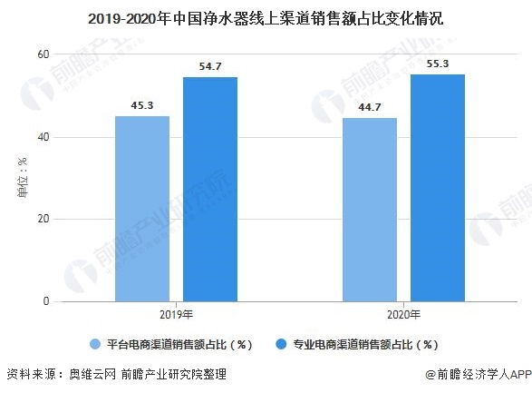 目前凈水器的線(xiàn)上銷(xiāo)售渠道主要分為平臺(tái)電商和專(zhuān)業(yè)電商兩大類(lèi),2019年凈水器通過(guò)平臺(tái)電商渠道銷(xiāo)售額占比為45.3%,通過(guò)專(zhuān)業(yè)電商渠道銷(xiāo)售額占比為54.7%;2020年平臺(tái)電商渠道銷(xiāo)售額占比進(jìn)一步下滑,2020年凈水器通過(guò)平臺(tái)電商銷(xiāo)售額占比為44.7%,通過(guò)專(zhuān)業(yè)電商銷(xiāo)售額占比上升為55.3%。