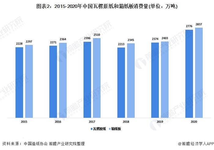 箱紙板和瓦楞紙板是中國(guó)紙類最主要的消費(fèi)類別,為廢紙回收行業(yè)提供了充足的市場(chǎng)空間。2020年我國(guó)箱紙板消費(fèi)量為2837萬(wàn)噸,較2019年同比增長(zhǎng)18.06%,占紙及紙板行業(yè)總消費(fèi)量的23.99%;瓦楞原紙消費(fèi)量2776萬(wàn)噸,較2019年增長(zhǎng)16.93%,占紙及紙板行業(yè)總消費(fèi)量的23.47%