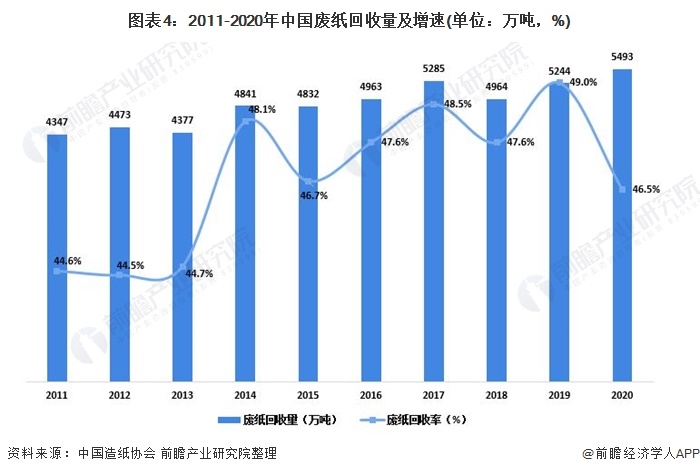 近年來(lái),政府嚴(yán)格控制廢紙等固體廢物的進(jìn)口,為中國(guó)廢紙回收企業(yè)的發(fā)展提供了機(jī)會(huì)。2020年,中國(guó)回收廢紙總量5493萬(wàn)噸,同比增長(zhǎng)4.75%,廢紙回收率達(dá)到46.5%。