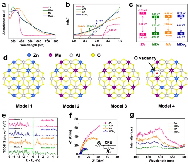 在本研究中,我們旨在揭示金屬取代效應(yīng)增強(qiáng)LDH光催化性能的機(jī)理,特別是闡明錳取代和氧空位對(duì)提高M(jìn)ZA光催化活性的貢獻(xiàn)。紫外可見吸收光譜(圖2a)和帶隙寬度(圖2b)顯示與ZA和MA相比,MZA的帶隙更適合光催化反應(yīng)。值得注意的是,MZA的帶隙比MZA-o略窄,這意味著帶隙的縮短不僅來自Mn取代,O空位在這個(gè)過程中也起到了一定的輔助作用。圖2c顯示了催化劑的能帶結(jié)構(gòu),觀察到MZA和MZA-o的價(jià)帶位置相近,而MZA的導(dǎo)帶低于MZA-o,說明氧空位對(duì)縮短帶隙的作用機(jī)制是降低導(dǎo)帶。在密度泛函理論計(jì)算中我們補(bǔ)充了模型4(圖2d),即具有一個(gè)氧空位的模型2(氧空位位置的選擇遵循最低總能量的原則),并計(jì)算了模型1-4的總態(tài)密度(TDOS)。如圖2e所示,模型的帶隙順序與圖2b中實(shí)驗(yàn)確定的帶隙結(jié)果一致,其中模型2和模型4具有非常相似的能帶結(jié)構(gòu),兩者的區(qū)別在于模型4的能帶結(jié)構(gòu)中出現(xiàn)了一個(gè)明顯的中間能級(jí),這表明O空位對(duì)縮短帶隙的貢獻(xiàn)是通過缺陷能級(jí)的形成來實(shí)現(xiàn)的。因此我們認(rèn)為Mn取代和O空位的協(xié)同作用是帶隙縮短的原因,其中Mn取代的貢獻(xiàn)占主導(dǎo)地位,O空位的作用相對(duì)較弱。此外,催化劑的阻抗譜(圖2f)和穩(wěn)態(tài)熒光光譜(圖2g)的結(jié)果進(jìn)一步證實(shí)了MZA的優(yōu)異光催化活性歸因于Mn取代和O空位,并且在提高載流子轉(zhuǎn)移能力方面,Mn取代的貢獻(xiàn)仍然大于O空位。