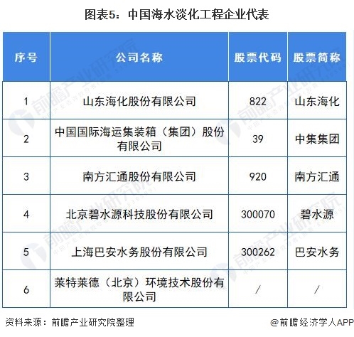 我國(guó)海水淡化工程企業(yè)較少,目前發(fā)展較好的企業(yè)有:上海巴安水務(wù)股份有限公司、萊特萊德(北京)環(huán)境技術(shù)股份有限公司、山東?;煞萦邢薰尽⒛戏絽R通股份有限公司、中國(guó)國(guó)際海運(yùn)集裝箱(集團(tuán))股份有限公司、北京碧水源科技股份有限公司等。