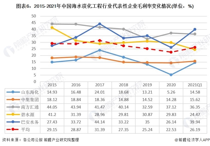 毛利率方面,中國(guó)海水淡化工程行業(yè)代表性企業(yè)中,2015-2021年一季度,南方匯通的毛利率在38%左右浮動(dòng),在代表性企業(yè)中處于較高的水平;山東?;c中集集團(tuán)則一直處于平均值以下,在15%左右的水平波動(dòng)。中國(guó)海水淡化工程行業(yè)代表性企業(yè)中毛利率平均水平隨時(shí)間變化不大,在27%水平附近波動(dòng)。